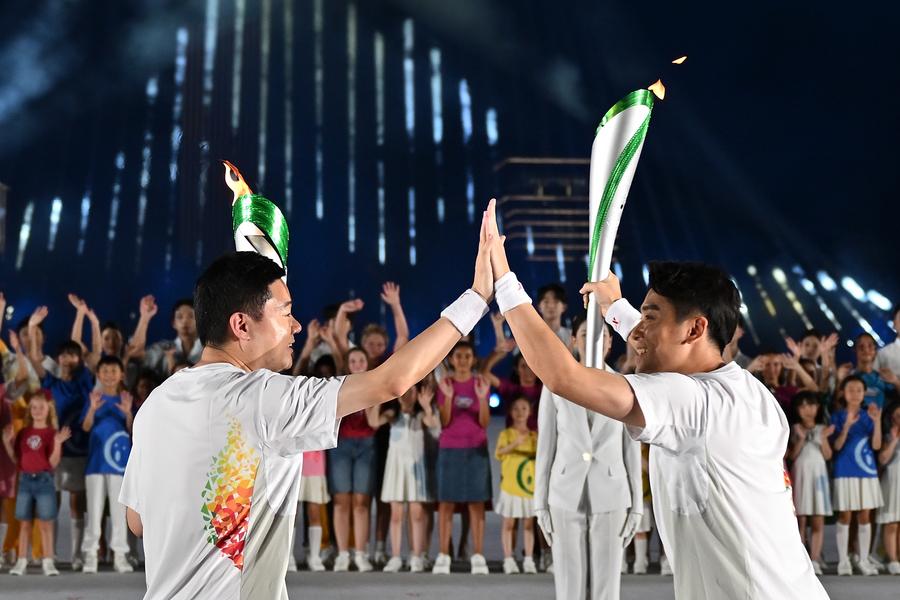 7 августа 2025 года, факелоносцы Дин Цзюньхуэй /слева/ и Дун Дун приветствуют друг друга на церемонии открытия Всемирных игр-2025 в Чэнду /пров. Сычуань, Юго-Западный Китай/. /Фото: Синьхуа/