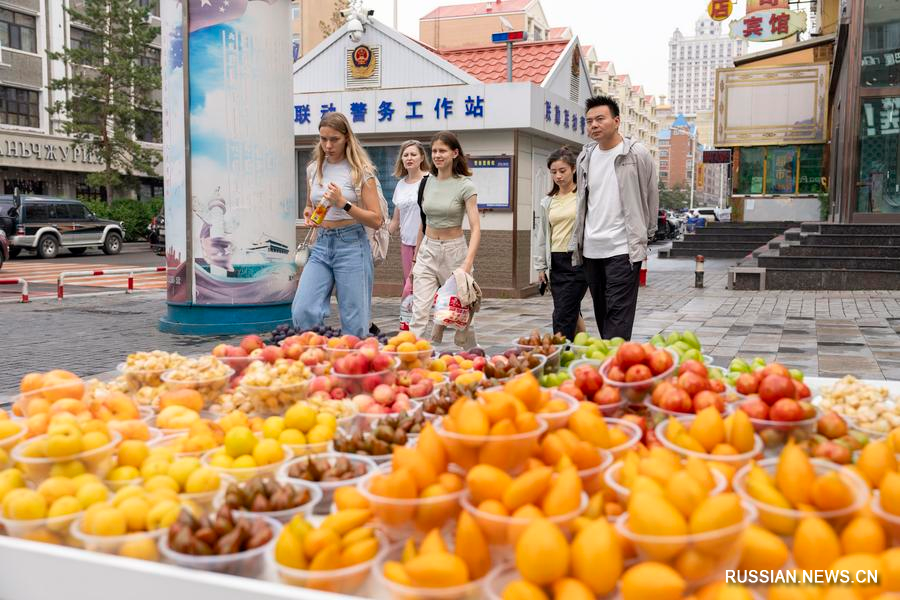 17 июля 2024 года, в городе Маньчжоули туристы проходят мимо фруктовой лавки. /Фото: Синьхуа/