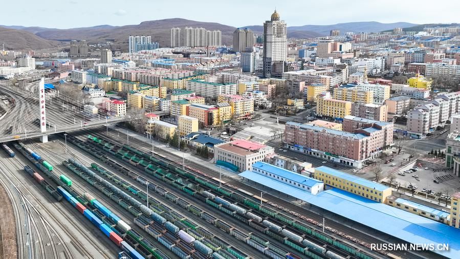 17 апреля 2024 года, на сделанной с помощью дрона фотографии запечатлен грузовой поезд на станции Суйфэньхэ, который готов к отправлению после завершения сборки груза. /Фото: Синьхуа/