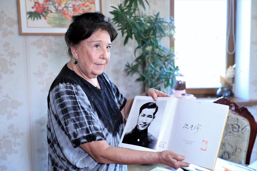 25 июня 2021 года, композитор из Казахстана Балдырган Байкадамова, дочь Бахытжана Байкадамова, у себя дома демонстрирует книгу о Сянь Синхае. /Фото: Синьхуа/
