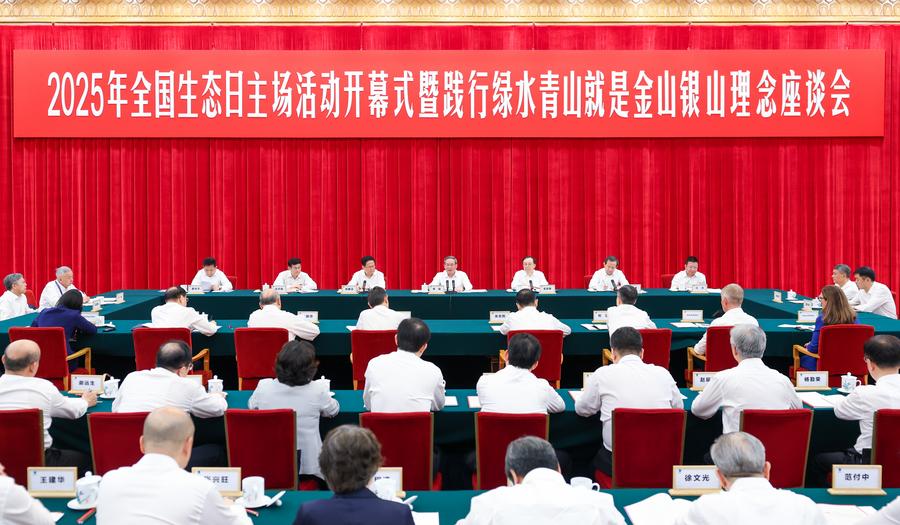 Пекин, 15 августа /Синьхуа/ -- Член Постоянного комитета Политбюро ЦК КПК, премьер Госсовета КНР Ли Цян присутствует на церемонии открытия главного мероприятия, посвященного Национальному дню экологии 2025 года, и на симпозиуме по реализации концепции "изумрудные воды и зеленые горы -- бесценное сокровище". /Фото: Синьхуа/