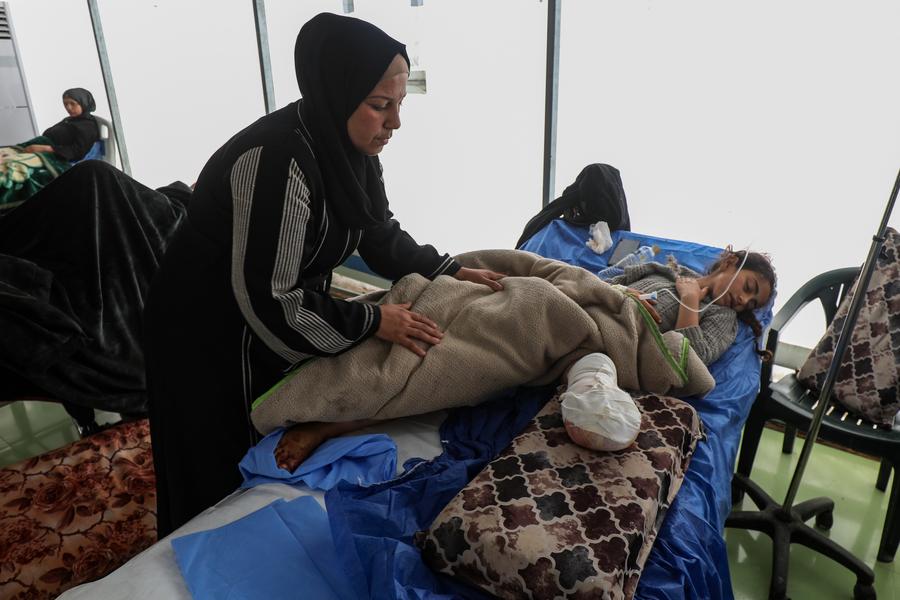 15 апреля, Газа. Палестинская девочка, эвакуированная из арабской больницы "Аль-Ахли", получает медицинскую помощь в полевом госпитале Кувейтского общества Красного Полумесяца в городе Газа. /Фото: Синьхуа/