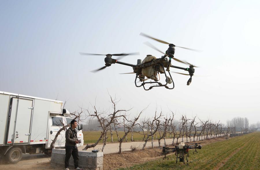 На фото от 27 февраля 2025 года запечатлен оператор, который с помощью дрона распыляет удобрения над пшеницей в одной из деревень провинции Шаньдун на востоке Китая. /Фото: Синьхуа/