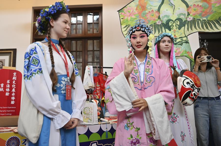 6 августа, Тяньцзинь, Китай. Молодые студенты из стран ШОС примеряют костюмы пекинской оперы во время культурного мероприятия. /Фото: Синьхуа/