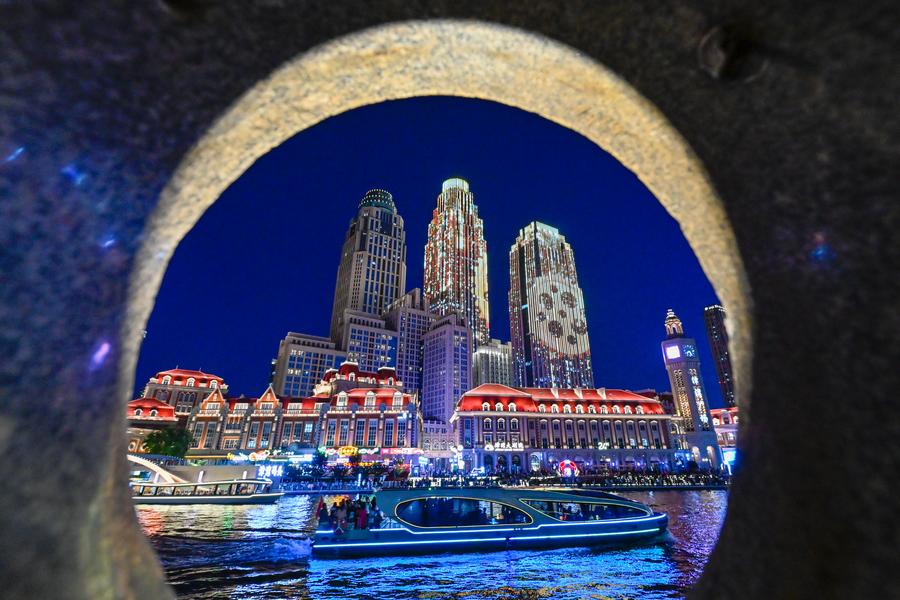 25 августа, Тяньцзинь, Китай. Люди катаются на лодках, наслаждаясь ночным видом на реку Хайхэ. /Фото: Синьхуа/