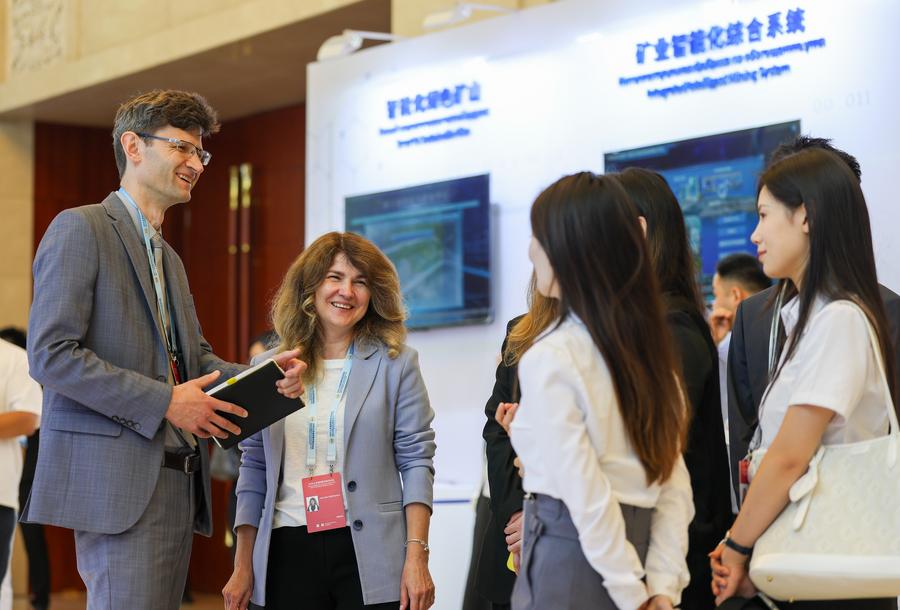 11 июля, Тяньцзинь, Китай. Гости и участники выставки общаются в интерактивной зоне во время Форума ШОС по цифровой экономике 2025 года. /Фото: Синьхуа/