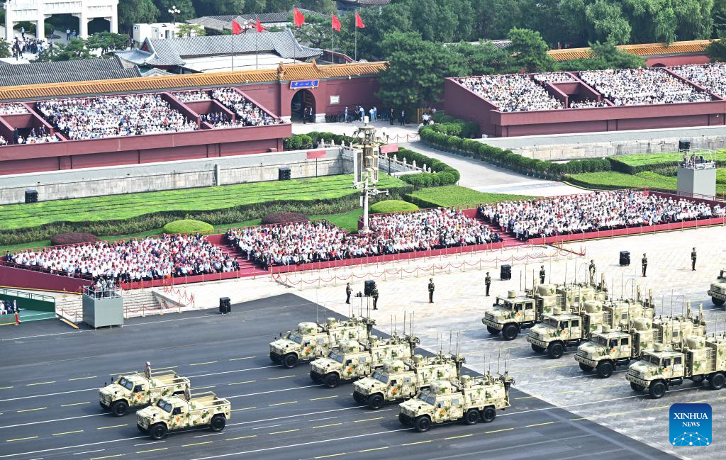 Пекин, 3 сентября /Синьхуа/ -- По площади Тяньаньмэнь в центре Пекина проехала колонна вооружений сил информационной поддержки в среду на военном параде по случаю 80-й годовщины Победы в Войне сопротивления китайского народа японским захватчикам и Победы в Мировой антифашистской войне.