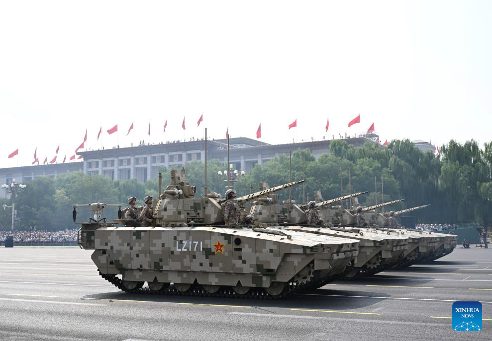 Пекин, 3 сентября /Синьхуа/ -- Колона наземных штурмовых бронемашин нового поколения Народно-освободительной армии Китая /НОАК/, включая танки "Тип-100" и боевые машины огневой поддержки "Тип-100", прошла маршем по площади Тяньаньмэнь на военном параде, посвященном Дню Победы.