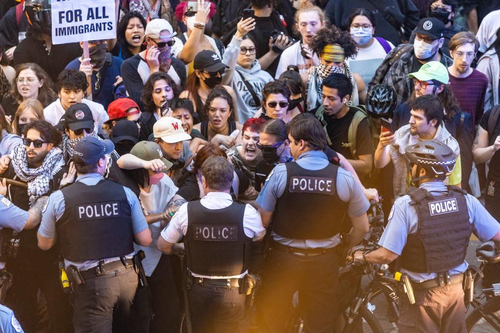10 июня, Чикаго, США. Протестующие против ICE и полиция на Стейт-стрит в центре города. /Фото: Синьхуа/