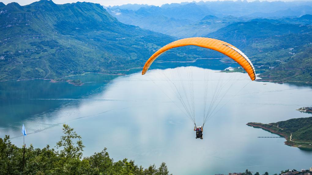 9 июля 2025 года, туристы познают на собственном опыте полеты на параплане на низкой высоте в городе Люпаньшуй провинции Гуйчжоу. /Фото: Синьхуа/