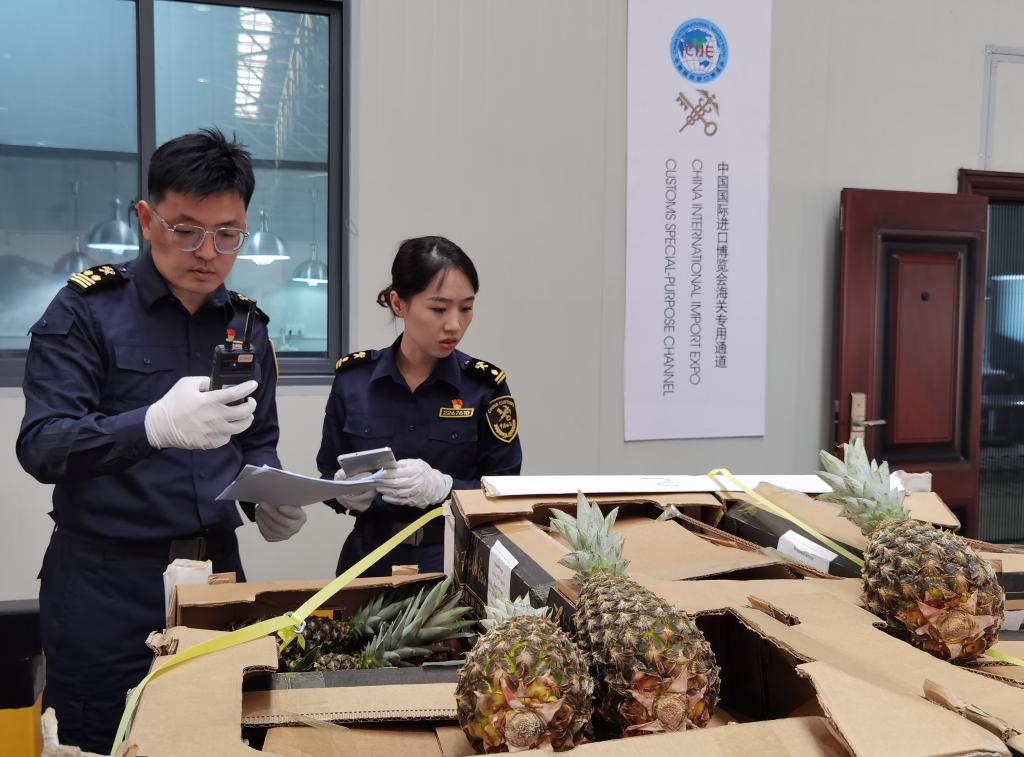3 ноября 2023 года, сотрудники Шанхайской таможни проверяют ананасы из Бенина. /Фото: Синьхуа/