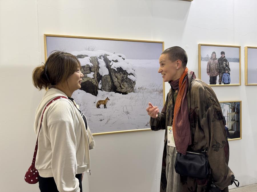 19 сентября 2025 года, Ирина Чмырева /справа/ рассказывает посетительнице о фотовыставке в ходе 25-го Пинъяоского международного фестиваля фотографии в одноименном городке провинции Шаньси /Северный Китай/. /Фото: Синьхуа/