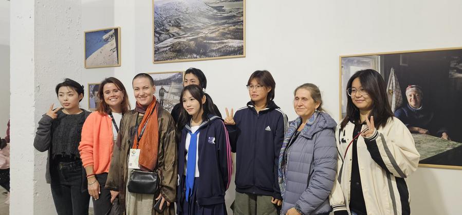 19 сентября 2025 года, российские фотографы Ирина Чмырева /третья слева/, Мария Груздева /вторая слева/ и Светлана Борозенцева /вторая справа/ с посетителями фотовыставки в ходе 25-го Пинъяоского международного фестиваля фотографии в одноименном городке провинции Шаньси /Северный Китай/. /Фото: Синьхуа/