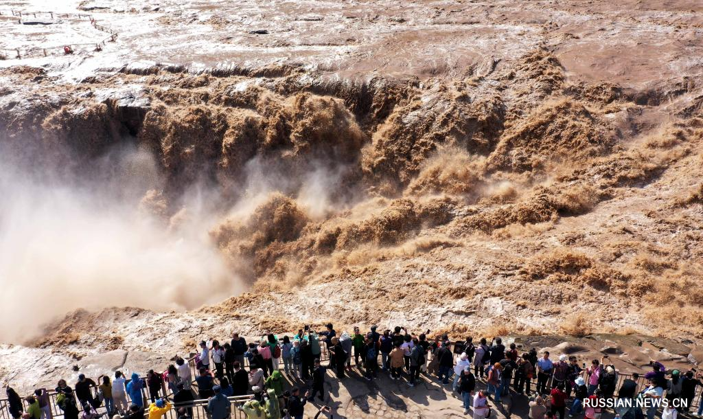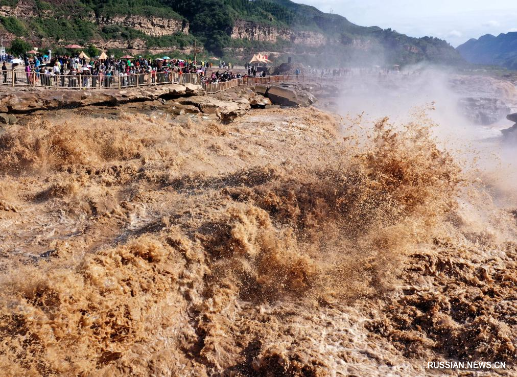 Цзисянь /пров. Шаньси/, 24 сентября /Синьхуа/ -- Во время осеннего паводка водопад Хукоу на реке Хуанхэ, который расположен на стыке уездов Ичуань /пров. Шэньси, Северо-Западный Китай/ и Цзисянь /пров. Шаньси, Северный Китай/, своими захватывающими пейзажами привлекает огромное количество туристов.