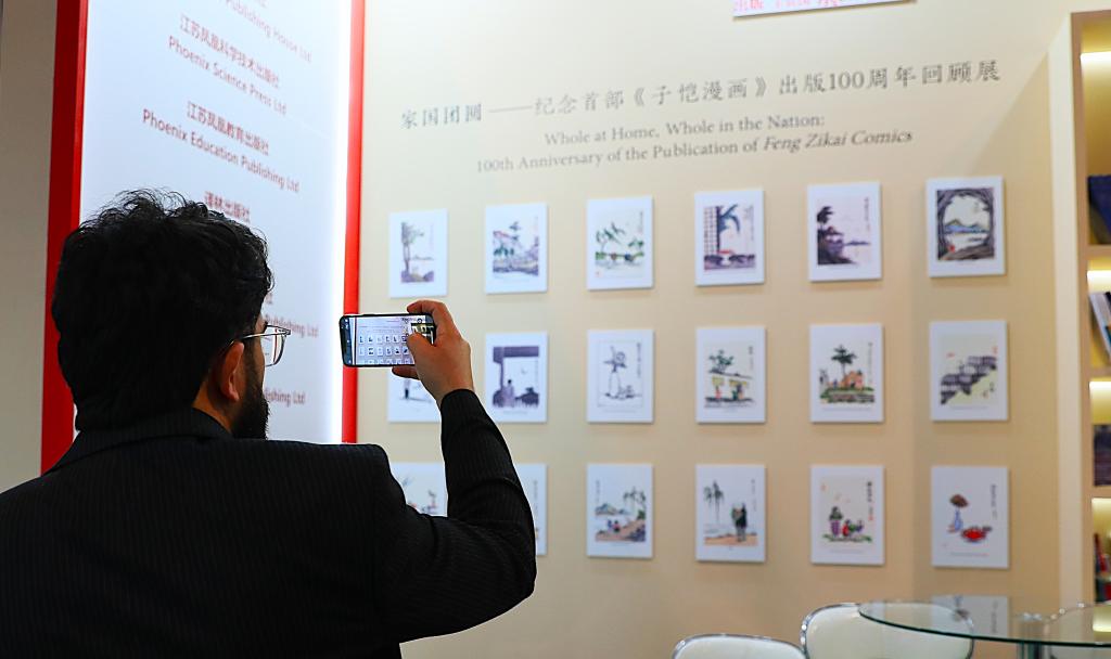 1 октября, Баку. Посетитель фотографирует экспозицию, посвященную 100-летию публикации комиксов китайского художника Фэн Цзыкая, на 11-й Бакинской международной книжной выставке. /Фото: Синьхуа/