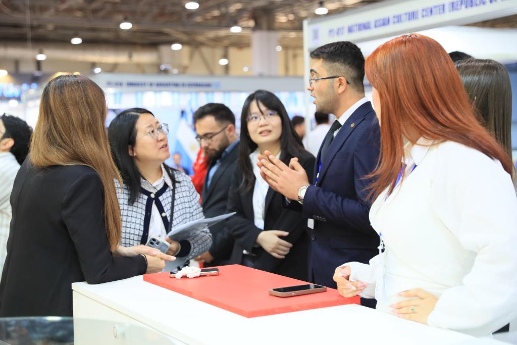 1 октября, Баку. Переговоры у стенда Китая на 11-й Бакинской международной книжной выставке. /Фото: Синьхуа/