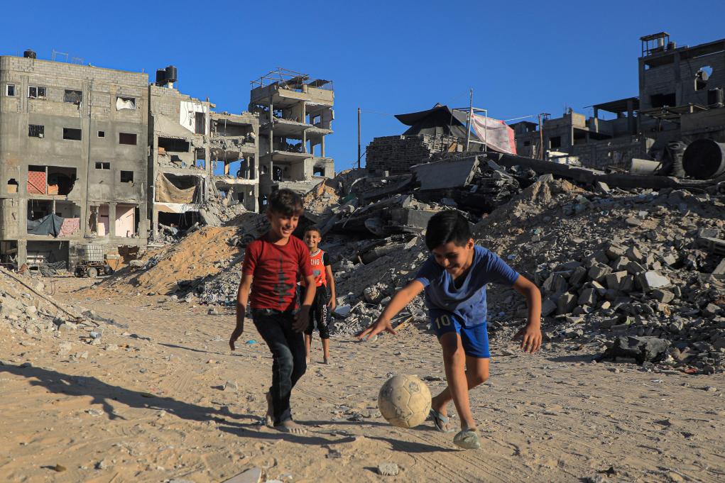 20 августа 2024 года, Газа. Дети играют в футбол рядом с разрушенными зданиями. /Фото: Синьхуа/