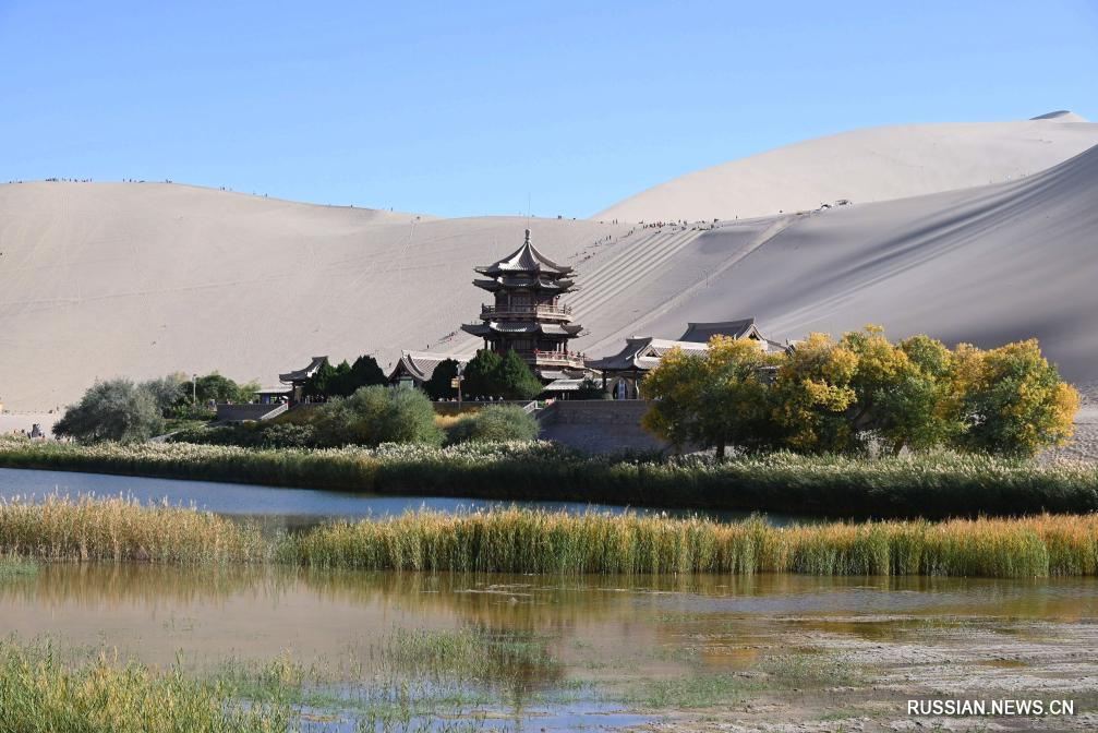 Дуньхуан /пров. Ганьсу/, 13 октября /Синьхуа/ -- Золотой осенью в живописной зоне дюн Миншашань и озера Юэяцюань, расположенной на территории провинции Ганьсу /Северо-Западный Китай/, взору приезжих открываются великолепные по красоте пейзажи. Множество туристов бродят по этому ландшафту, погружаясь в уникальное очарование пустыни.