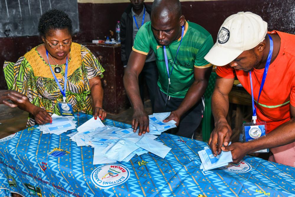 12 октября, Яунде. Сотрудники избирательной комиссии подсчитывают бюллетени на избирательном участке. /Фото: Синьхуа/