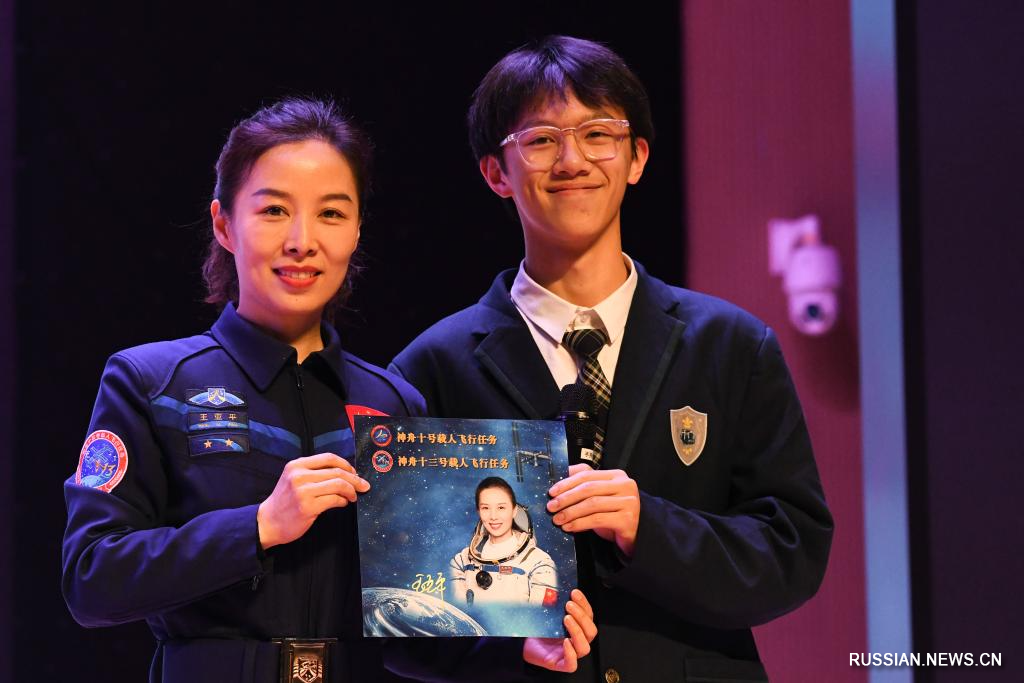 24 апреля 2023 года, в Шестой средней школе города Хэфэй женщина-космонавт Ван Япин /слева/ запечатлена со школьником на памятном фото. /Фото: Синьхуа/