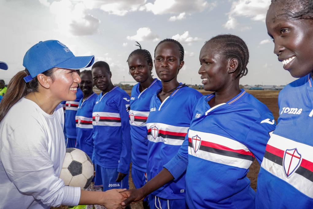 На второй фотографии на примитивной спортивной площадке в лагере беженцев Какума на северо-западе Кении китайская олимпийская чемпионка по шорт-треку и посол доброй воли Агентства ООН по делам беженцев Ян Ян пожимает руки и общается с членами местной женской футбольной команды. Среди них -- Маргарет Макдомник из Южного Судана.