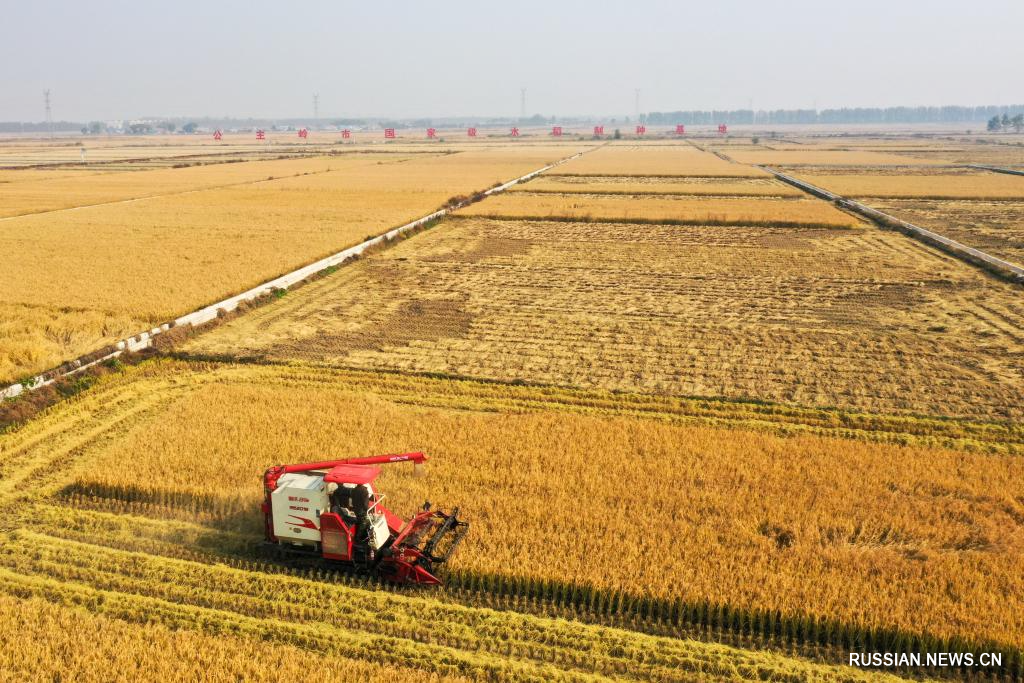 14 октября 2025 года, в городе Гунчжулин провинции Цзилинь /Северо-Восточный Китай/ фермеры с помощью сельскохозяйственной техники убирают рис. /Фото: Синьхуа/