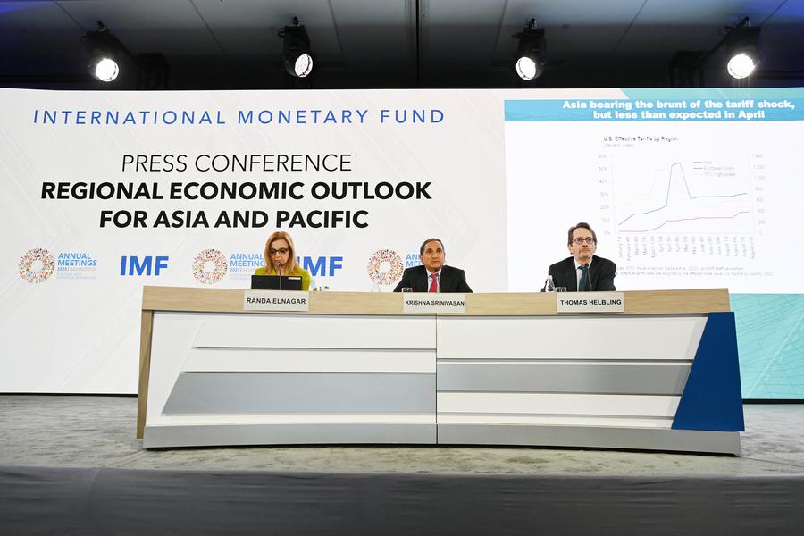 16 октября, Вашингтон. Директор Азиатско-Тихоокеанского департамента МВФ Кришна Шринивасан /в центре/ выступает на пресс-конференции, посвященной региональным экономическим перспективам Азиатско-Тихоокеанского региона. /Фото: Синьхуа/