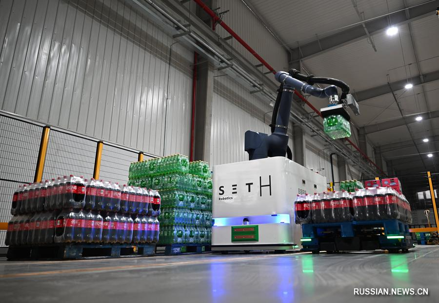 16 октября 2025 года, на новом заводе компании Swire Coca-Cola Ltd. в городе Чжэнчжоу пров. Хэнань /Центральный Китай/, работает интеллектуальный робот для подбора и распределения товаров. /Фото: Синьхуа/