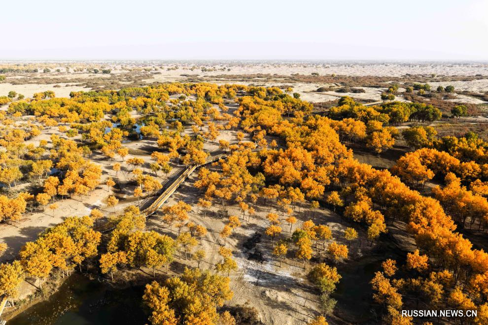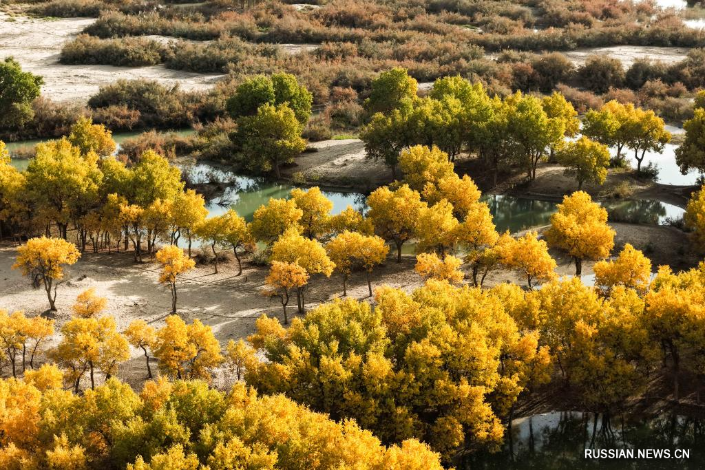 Хотан /Синьцзян/, 22 октября /Синьхуа/ -- В настоящее время тополиные рощи в округе Хотан в Синьцзян-Уйгурском автономном районе /СУАР, Северо-Западный Китай/ достигли пика своего расцвета. Обширные тополиные леса, преображенные осенними красками, отражаются в воде и небе, создавая золотистый осенний пейзаж.