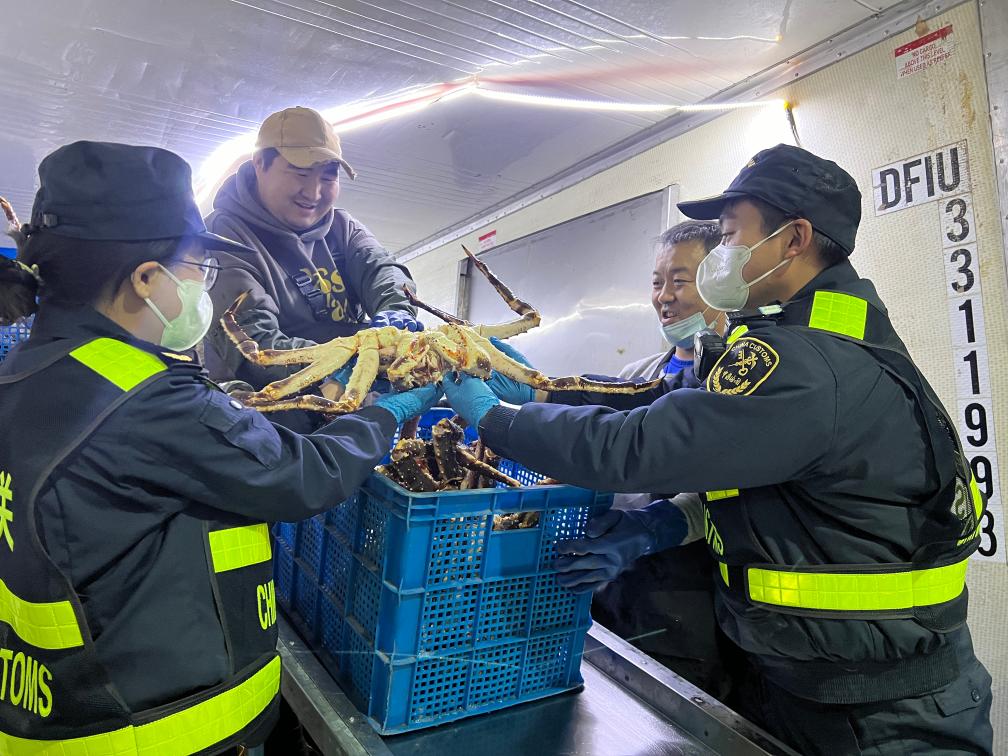 30 октября 2024 года, живые камчатские крабы проходят таможенный контроль в КПП Цзимунай в Синьцзян-Уйгурском автономном районе /СУАР, Северо-Западный Китай/. /Фото: Синьхуа/