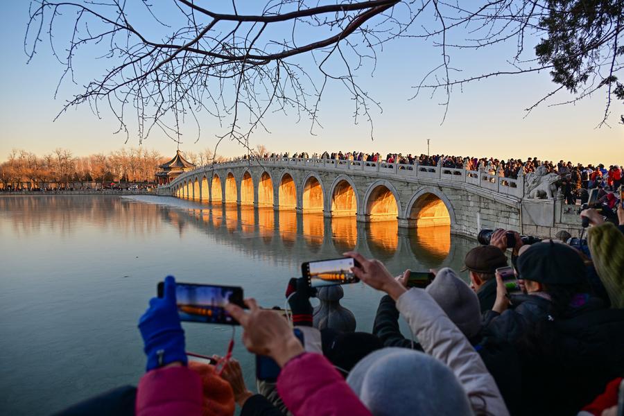 22 декабря 2024 года, посетители фотографируют освещенный закатом мост из 17 пролетов в парке Ихэюань в Пекине. /Фото: Синьхуа/