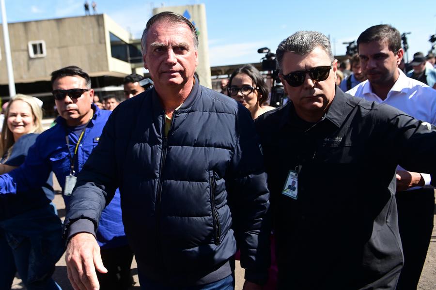 18 июля, Бразилиа. Бывший президент Бразилии Жаир Болсонару /слева на переднем плане/ покидает штаб-квартиру Уголовной полиции Бразилии, где на него надели электронный браслет для наблюдения. /Фото: Синьхуа/