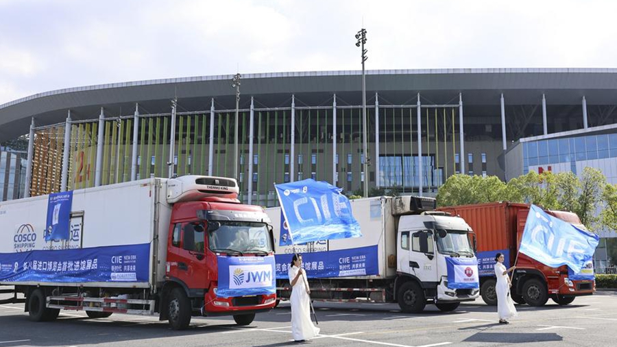 23 октября 2025 года, грузовые автомобили, груженные экспонатами для предстоящего 8-го Китайского международного импортного ЭКСПО /CIIE/, во время церемонии, посвященной доставке экспонатов в Национальный выставочный и конференц-центр /Шанхай/, главное место проведения CIIE. /Фото: Синьхуа/