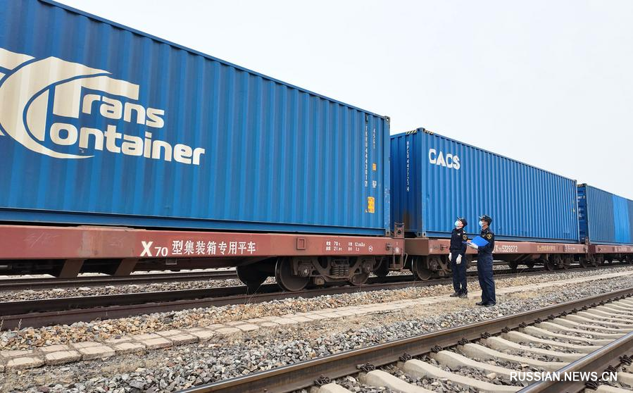 17 июля 2024 года, двое сотрудников таможни досматривают грузовой поезд Китай-Европа на железнодорожном КПП Маньчжоули на севере Китая. /Фото: Синьхуа/