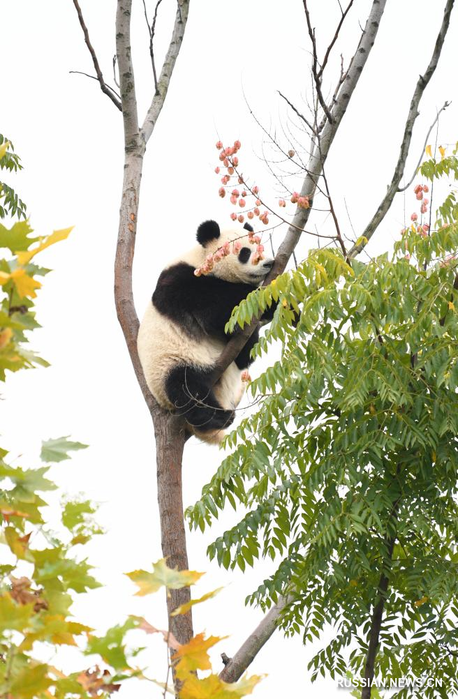 Чэнду, 8 ноября /Синьхуа/ -- На фотографии запечатлены панды на исследовательской базе по разведению больших панд в г. Чэнду /адм. центр пров. Сычуань, Юго-Западный Китай/.