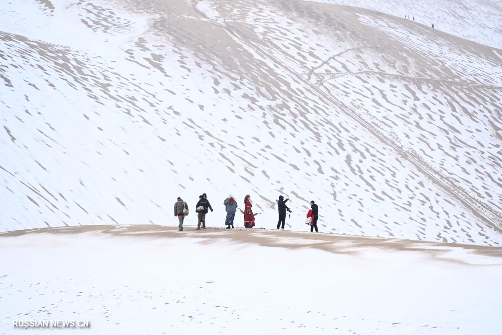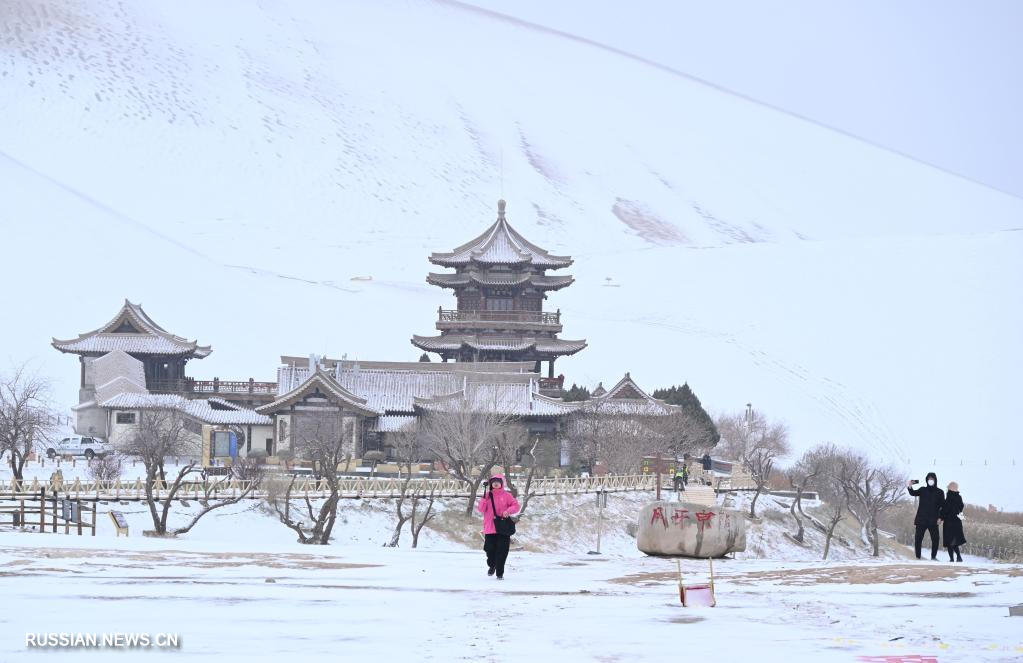 Дуньхуан, 24 ноября /Синьхуа/ -- 23 ноября под влиянием холодных воздушных масс в городе Дуньхуан провинции Ганьсу /Северо-Западный Китай/ выпал снег. Знаменитые местные достопримечательности, такие как гора Миншашань и озеро Юэяцюань, облачились в серебряный наряд и выглядят невероятно красиво.