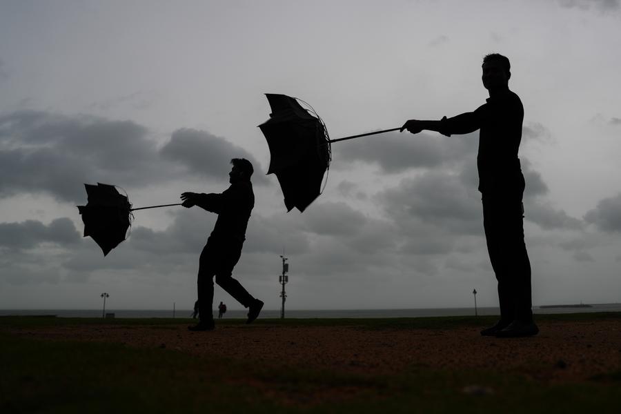 27 ноября, Коломбо. Люди держат зонтики, сломанные сильным ветром. /Фото: Синьхуа/