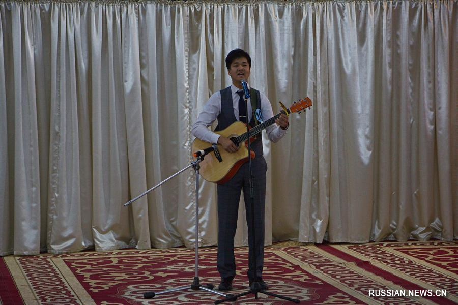 5 декабря, Бишкек. Студент из Института Конфуция при Ошском государственном университете Эрбол Келдибаев выступает в финале 12-го конкурса по исполнению китайских песен среди студентов Кыргызстана. /Фото: Синьхуа/