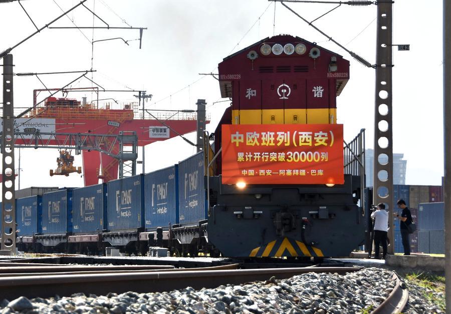 13 августа 2025 года, грузовой ж/д состав рейсом X9043 в рамках международных ж/д грузоперевозок Китай-Европа готовится к отправке в Баку, столицу Азербайджана, со станции международного порта города Сиань пров. Шэньси на северо-западе Китая. /Фото: Синьхуа/