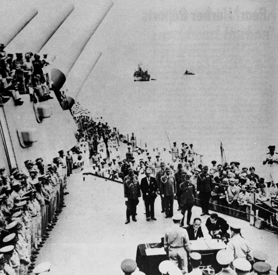 2 сентября 1945 года, Токийский залив. Церемония капитуляции Японии на борту линкора военно-морских сил США "Миссури". /Фото: Синьхуа/