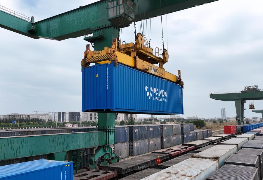 29 ноября 2023 года, контейнер перемещают на грузовой поезд Китай-Европа на станции Цзянъиньган в городе Фучжоу /адм. центр пров. Фуцзянь, Восточный Китай/. /Фото: Синьхуа/