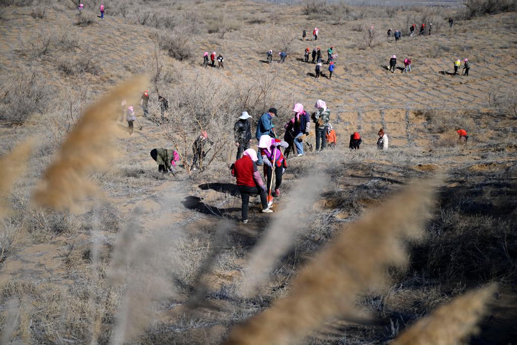 19 марта 2024 года, люди сажают пескоукрепляющие растения в Национальном природном заповеднике Байцзитань, который расположен на юго-западной окраине пустыни Му-Ус в городе Линъу Нинся-Хуэйского автономного района /Северо-Западный Китай/. /Фото: Синьхуа/