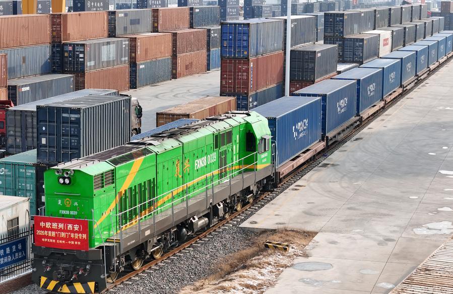 21 января 2026 года, первый в 2026 году специальный грузовой поезд Китай-Европа, груженный праздничными товарами, посвященными празднику Весны /Чуньцзе, традиционный китайский Новый год по лунному календарю/, прибыл в Сианьский международный порт "Чаньба". /Фото: Синьхуа/