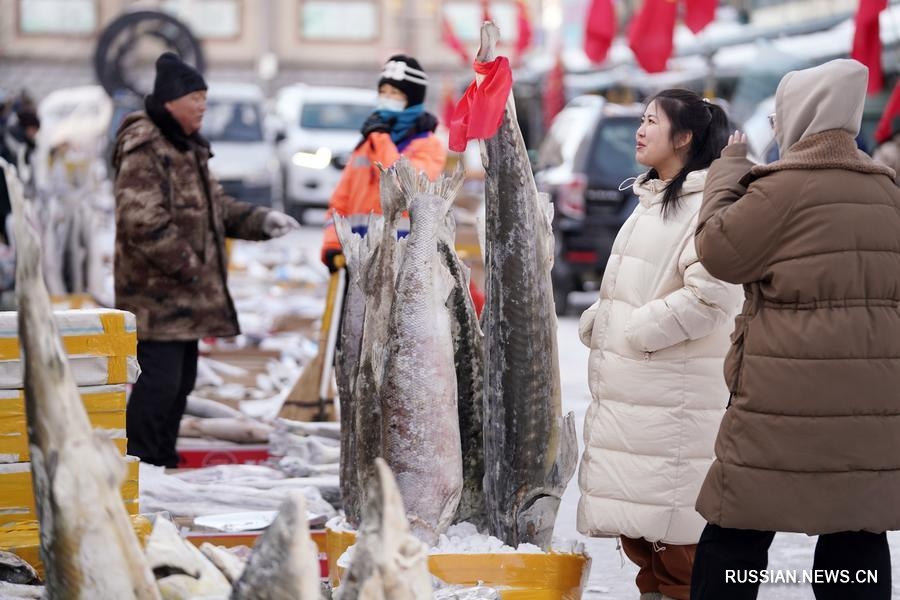 31 января 2024 года, потенциальные покупатели прицениваются к замороженной рыбе на одном из рынков водного промысла в городе Фуюань /пров. Хэйлунцзян, Северо-Восточный Китай/. /Фото: Синьхуа/