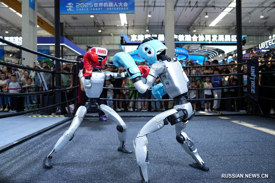 11 августа 2025 года, в выставочном зале Всемирной конференции по робототехнике, проходящей в Пекине, зрители наблюдают за поединком роботов-боксеров на ринге при стенде компании Unitree Robotics. /Фото: Синьхуа/