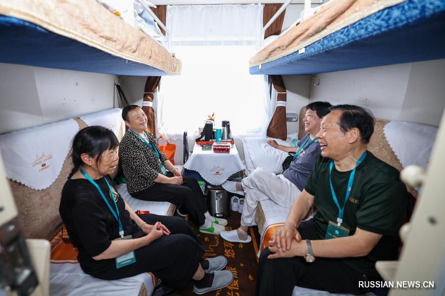 19 мая 2025 года, туристический "серебряный" поезд отправился из города Нинбо провинции Чжэцзян /Восточный Китай/ в Синьцзян, начав 18-дневное путешествие. Пассажиры на фото общаются в вагоне. /Фото: Синьхуа/