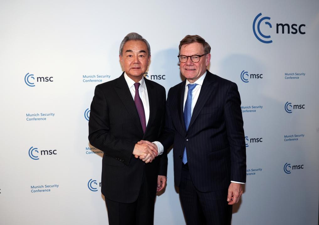 13 февраля, Мюнхен, Германия. Член Политбюро ЦК КПК, глава МИД КНР Ван И /слева/ обменивается рукопожатиями с министром иностранных дел ФРГ Йоханном Вадефулем. /Фото: Синьхуа/