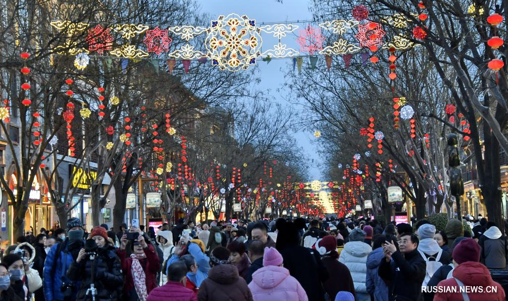 Пекин, 17 февраля /Синьхуа/ -- В каникулы по случаю праздника Весны /Чуньцзе, традиционный китайский Новый год по лунному календарю/ множество людей приезжают на улицу Цяньмэнь Дацзе в историческом центре китайской столицы, чтобы погулять по старинным переулочкам, попробовать традиционные уличные лакомства, ощутить дух древнего Пекина.