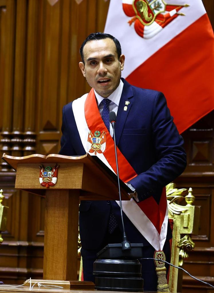 10 октября 2025 года, Лима. Хосе Хери произносит речь после того, как он был приведен к присяге в качестве президента Перу во время церемонии в Конгрессе. /Фото: Конгресс Перу/Синьхуа/