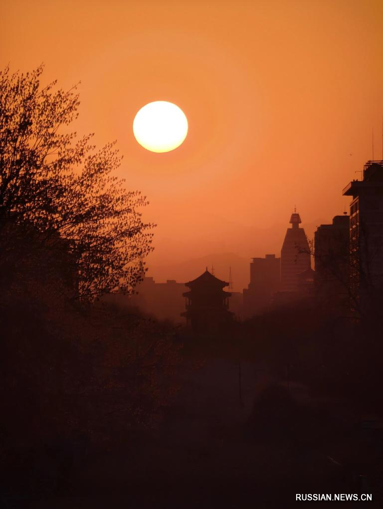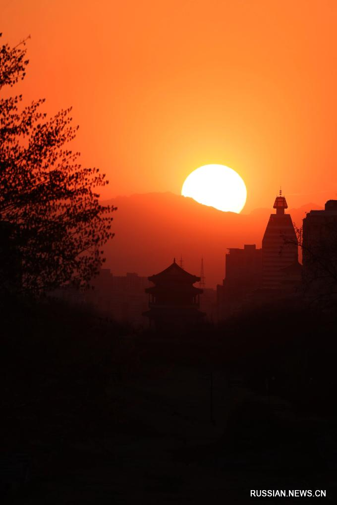 Пекин, 19 марта /Синьхуа/ -- На фото от 18 марта запечатлен закат в Парке руин городской стены династии Мин в Пекине.